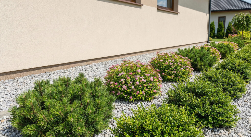 Złota Zasada „Opaski”: Między ścianą budynku a roślinami musi znajdować się pas buforowy (tzw. opaska) o szerokości minimum 40-60 cm. Najlepiej, aby była wysypana żwirem, kamykami lub wyłożona kostką. Zapewnia to cyrkulację powietrza, odprowadza wodę i ułatwia prace konserwacyjne przy cokole.