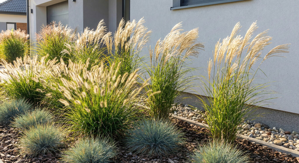 Trawy są idealne przy elewacjach, ponieważ ich ażurowa struktura nie blokuje przepływu powietrza tak bardzo jak lite krzewy.